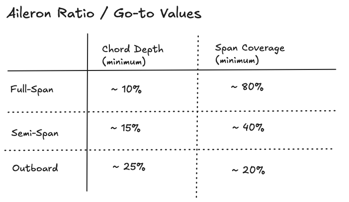 For practical design, these geometric relationships can be translated into typical proportions of span coverage and chord depth, which provide reliable roll authority for most airplane configurations.