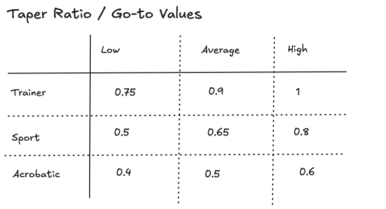A Trainer favors moderate or minimal taper to maintain forgiving stall progression. A Sport airplane balances lift efficiency with controllability. An Acrobatic design may accept stronger taper to reduce tip mass and emphasize roll response, provided stall control is handled deliberately.